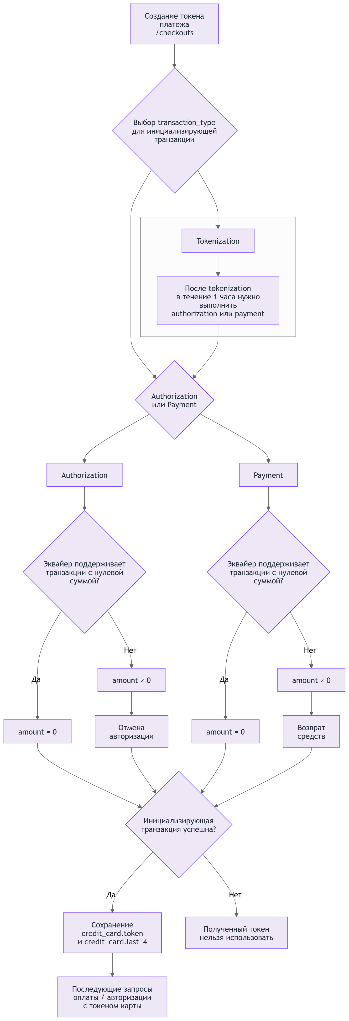 tokenizationв качествеtransaction_type, вы можете указать любую сумму в параметреamount; - для типов транзакции